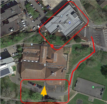 There is a drop off / unloading area adjacent to the hall – the yellow arrow indicates the entrance from the drop off area. There is a multi-story car park adjacent to the Olympiad sports hall – top red box on the drawing below. This is currently a pay and display car park, please ensure you pay, at the time of writing the fee is £1.40 / day, but please check on the day. The adjacent street parking is for local residents only.